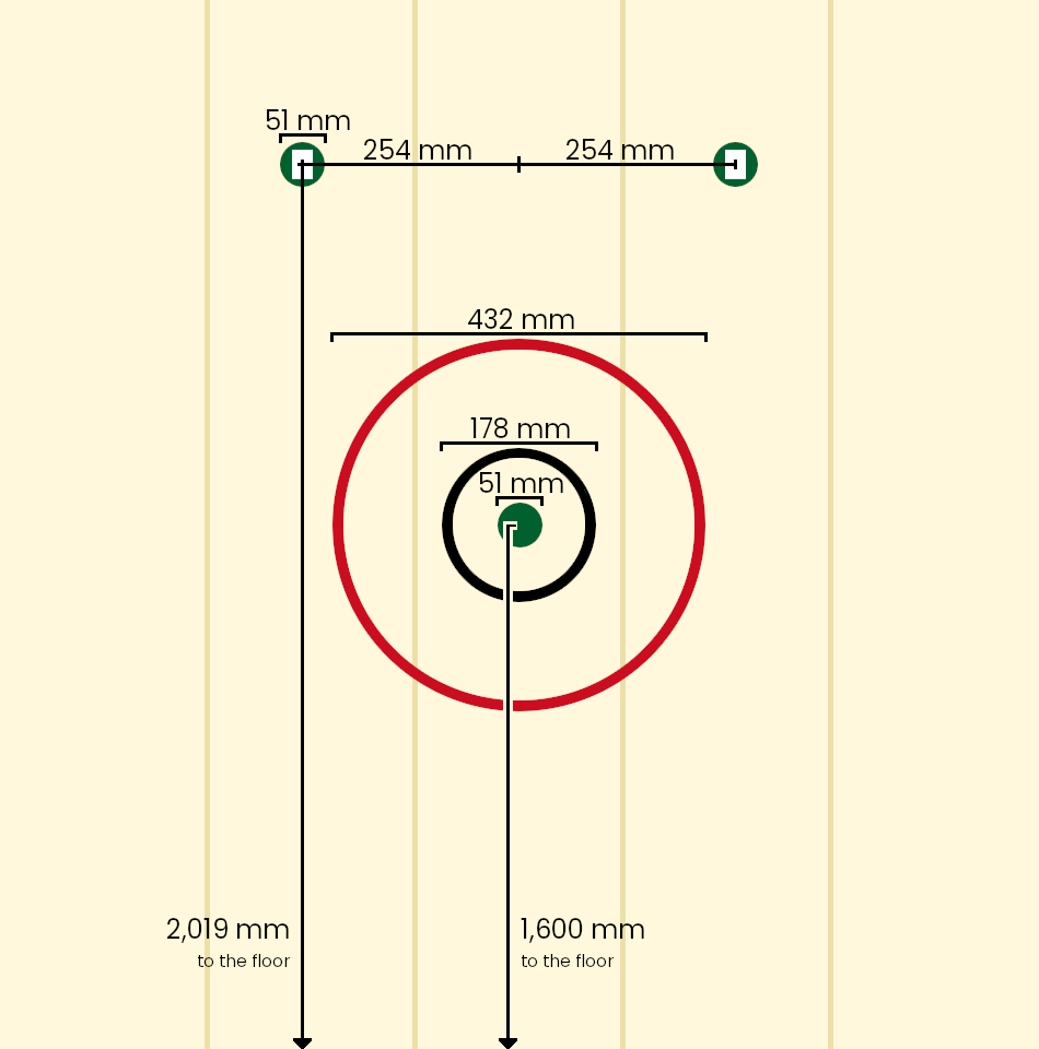 The center of the bullseye sits 63” (1,600 mm) from the floor and centered horizontally on the target surface. These elements are centered on this point: